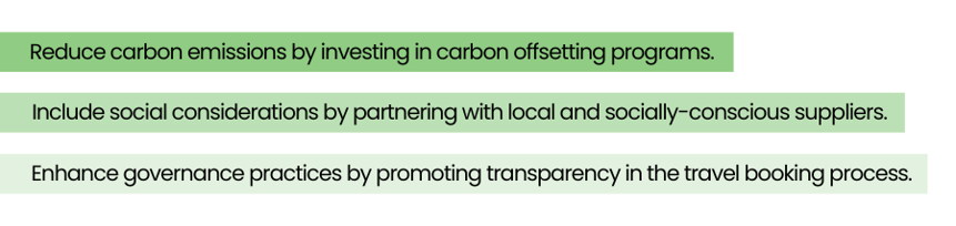 Setting measurable goals and targets for ESG-focused travel policies. These goals should be communicated throughout every area of the business, from employees to stakeholders.